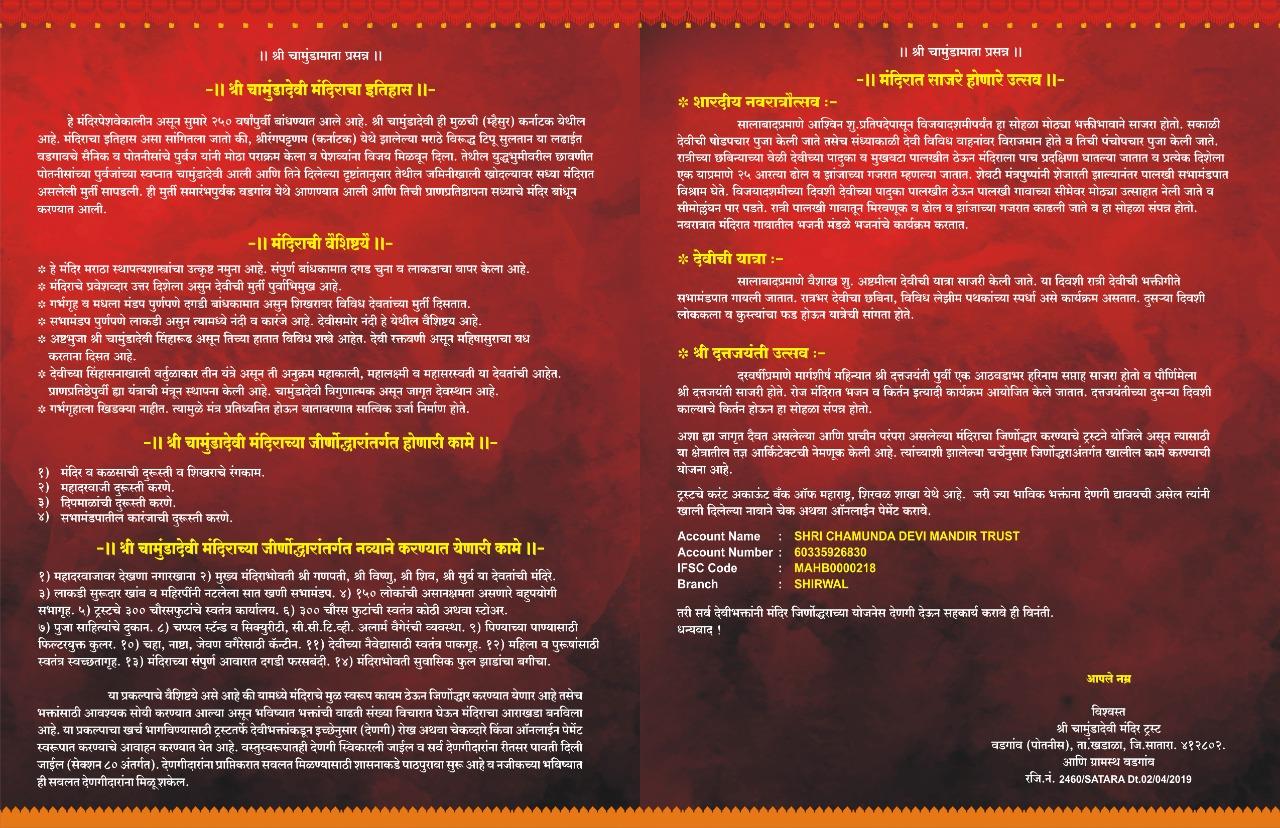are completed with one arati for each direction. Likewise 25 aratis in total are sung with accompaniment of dhol and zanja. In the end, mantrapushpanjali is recited and then the palakhi rests for the day in the Sabhamandap. On Vijayadashami, the Padukas of devi are placed in the palakhi and with a lot of enthusiasm, the palakhi is taken to the border of the village to perform Seemollanghan (depictive crossing the border). At night, the pakhi procession is carried out through the village with sounds of dhol and zanja and then finally this festival ends. During navartra, devotional songs are sung by professional devotional village groups.
